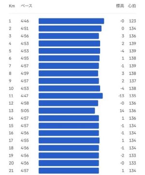 7日前の皇居25km走、4日前の駒沢公園22km走の疲れが残っていると思ったので、目標は4:50/kmペース以内。