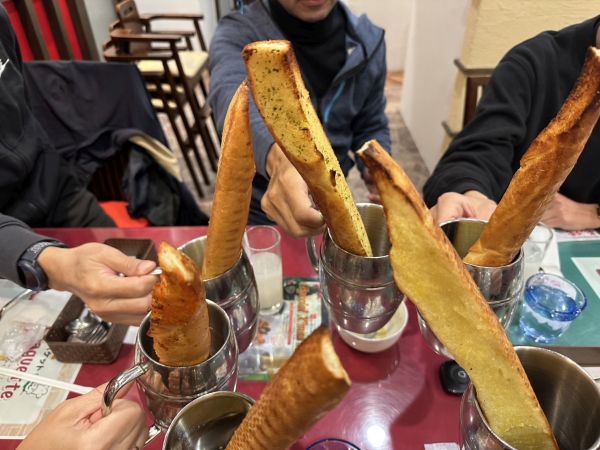 レース後に食べた物。鳥が入っている。真ん中はチーズなど。餅をトッピングしたからトッポギ?