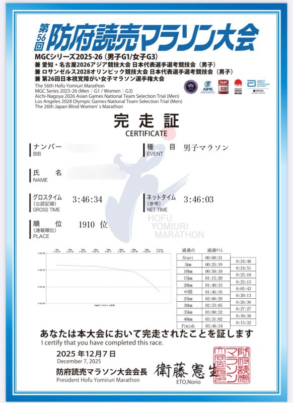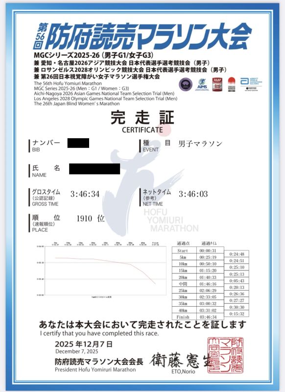フルマラソン :グロスタイム3時間26分00秒、ネットタイム3時間25分26秒