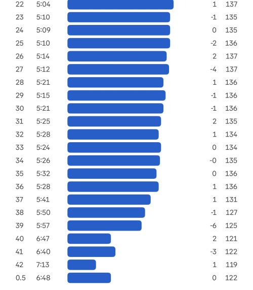 10kmまで遅く、遅れを取り戻そうとした結果、15km地点で左ふくらはぎを軽く攣り、17kmを過ぎてから体調も悪くなり、停止。