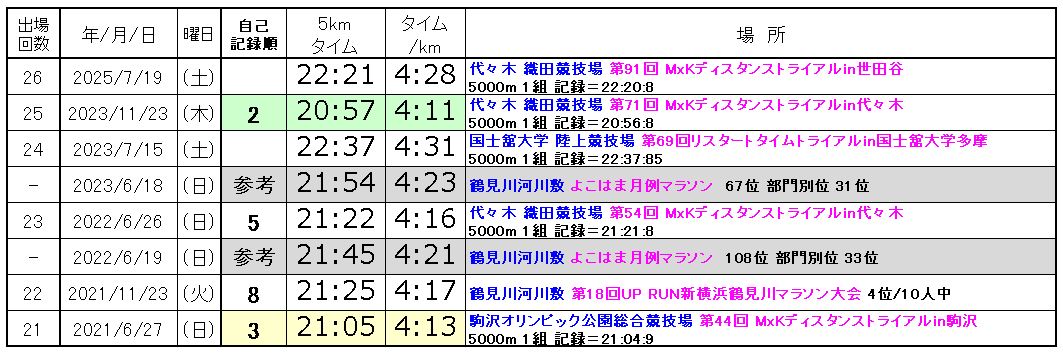 7日前の皇居25km走、4日前の駒沢公園22km走の疲れが残っていると思ったので、目標は4:50/kmペース以内。