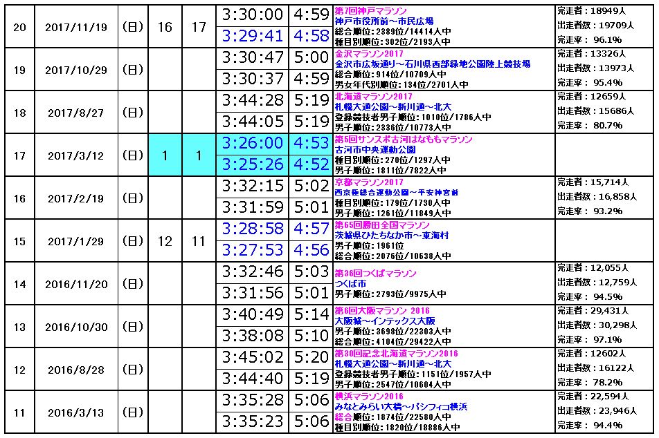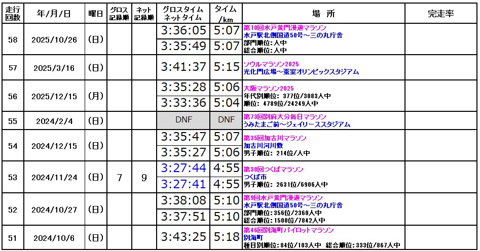 フルマラソン :グロスタイム3時間26分00秒、ネットタイム3時間25分26秒