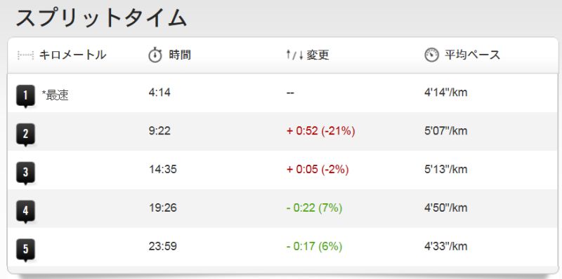 最初の5km通過時のタイムも23分49秒の自己新記録。最初の5kmの平均ペースは4分46秒/km。