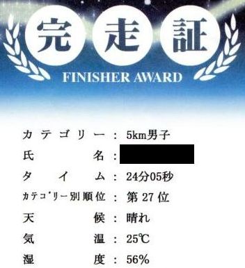 完走証。10km走る人はレベルが高いので、もっとペースを上げないと順位も上がらない(笑)